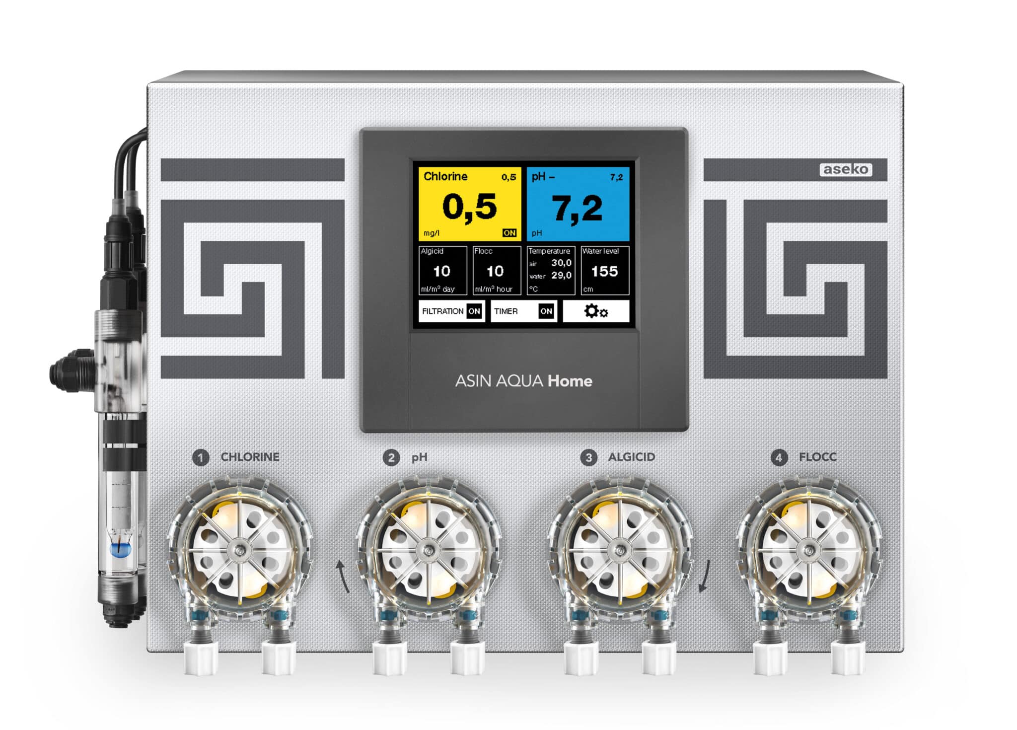 ASEKOS lyxenhet ASIN AQUA Home VS är ett innovativt doserings-och kontrollsystem som både mäter vattenkvaliteten i poolen och doserar rätt mängd kemikalier, så att du kan tänka på annat. ASIN AQUA Home VS har ett hölje av rostfritt stål och är utrustad med 4 st peristaltiska pumpar för extra hållbarhet, användarvänlig touchskärm med hög kontrast, pooltemperaturgivare, elektronisk flödesvakt, samt sondhållare, doserpumpar och flödeskontroll som alla är integrerade.ASIN AQUA Home VS passar pooler upp till 250 m3 och har även LAN-anslutning som gör att den kan kopplas till Internet för övervakning via mobil eller dator vart du än befinner dig.Detta superverktyg har även andra intelligenta systemkontrollfunktioner som styrning av poolpump, automatisk backspolning (tex med Besgo 5-way valve), vattenpåfyllning, styrning av värmeenheter och vinterdrift (vid komplettering med rätt tillbehör).